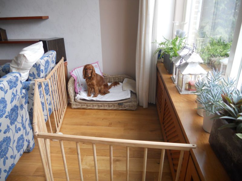 Lotje heeft een mooie plaats achter de bank met een hek zodat Lotje er niet uit kan en de kinderen er niet bij .